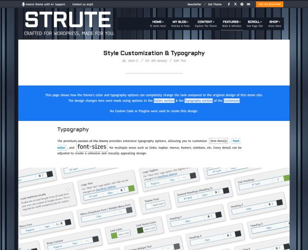 The premium version of the theme provides extensive typography options, allowing you to customize font-family, font-color, and font-sizes for multiple areas such as links, topbar, menus, footers, sidebars, etc. Every detail can be adjusted to create a cohesive and visually appealing design.